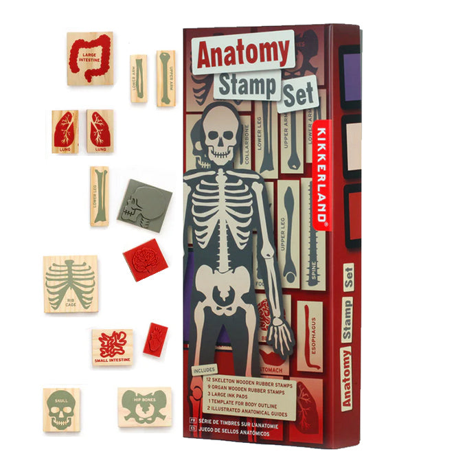 Have fun creating skeletons and learn about about organs and the inner workings of the body. Includes 21 rubber stamps, 3 ink pads and 1 double sided stencil with 2 educational sleeves.