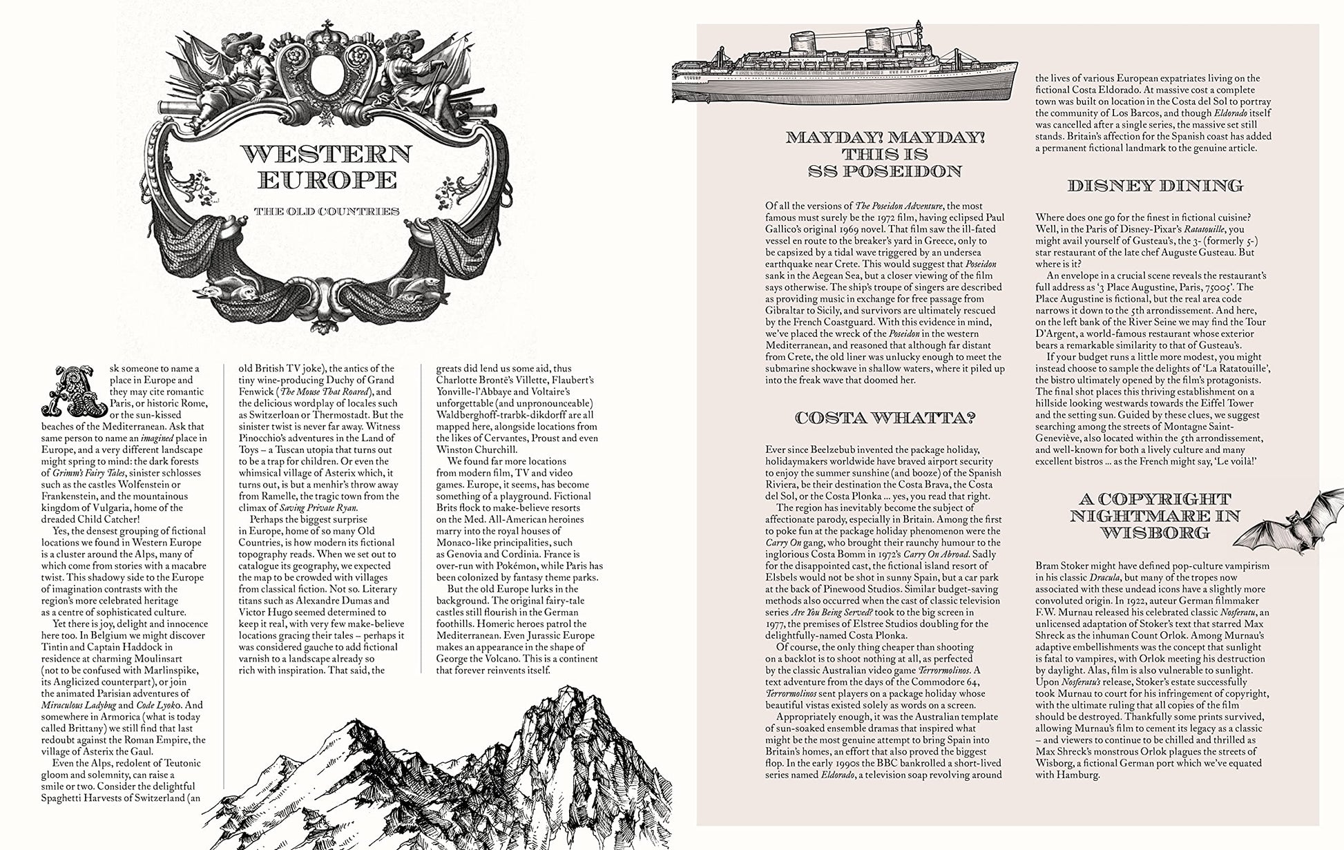 From Stephen King’s Salem’s Lot to superhero Wakanda, from Lilliput of Gulliver's Travels to Springfield in The Simpsons, a wondrous atlas of imagined places around the world. Locations from film, tv, literature, myths, comics and video games are plotted in a series of beautiful vintage-looking maps.