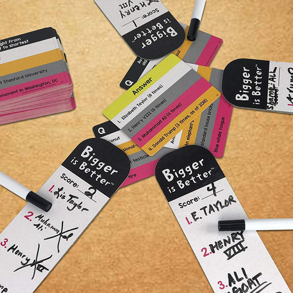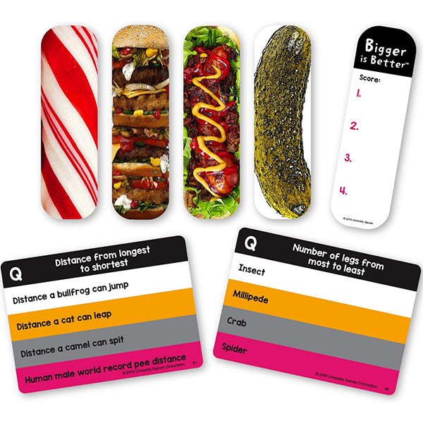 A fun party game for adults where size really does matter. This is a game of measurement - biggest to smallest, heaviest to lightest, longest to shortest. The trick is to put everything in the right order, which is harder than you might think. Pickle, hot dog, candy cane, or hamburger? Important questions like whether a camel can spit further than the world record human male pee distance...
