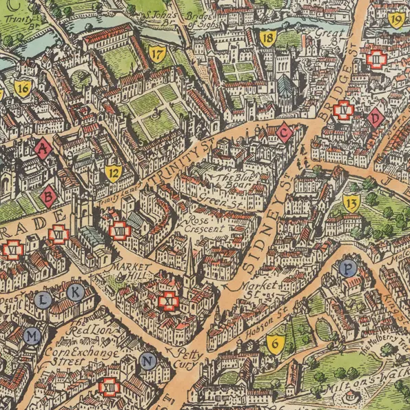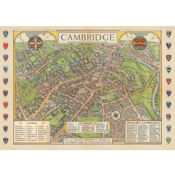 Attractive vintage map of Cambridge (1929) showing university colleges and civic buildings and bordered by the college coats of arms. Adapted from Cambridge: No. 1 of the Wayabout series of pictorial maps, by Spencer Hoffman. Courtesy David Rumsey Map Collection. This would make a fascinating wall poster for those interested in the history of the city of Cambridge and its university.
