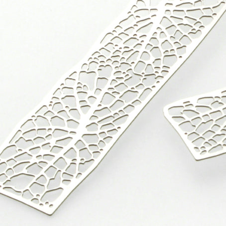 A pair of delicate rectangular earrings with slightly irregular edges. The pattern was 'grown' in a computer simulation using algorithms which imitate leaf venation, and then etched from a sheet of stainless steel. These quirky earrings combine innovative design and new technology to create unusual and unique pieces of wearable art.