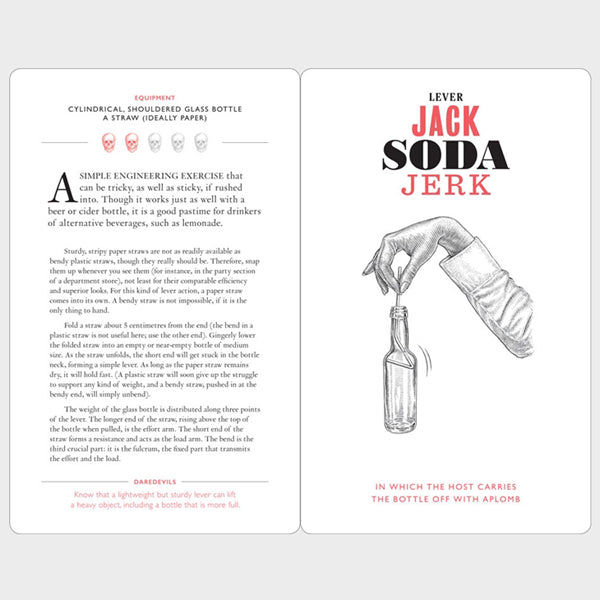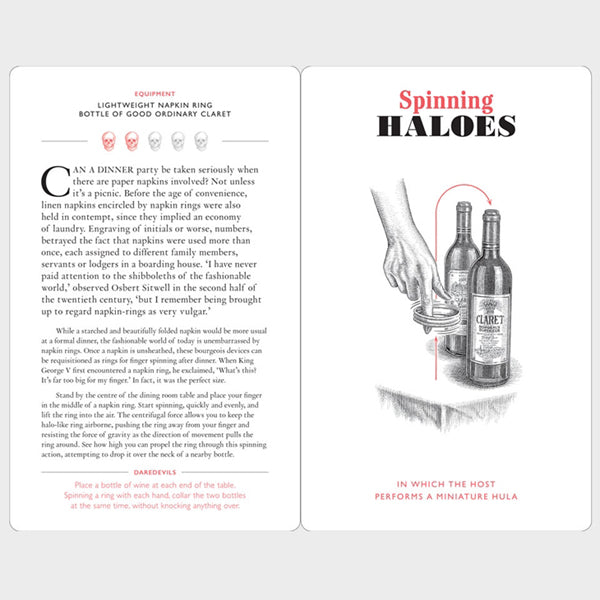 Spice up your dinner parties with amazing tricks and challenges using wine glasses, candles, knives and other readily available objects. Each one of this set of 21 cards provides an illustration and step-by-step instructions along with an explanation of the science behind the trick. From sabring a bottle of champagne to hammering a needle through a coin, dinner will never be the same again.