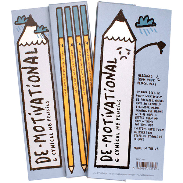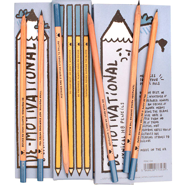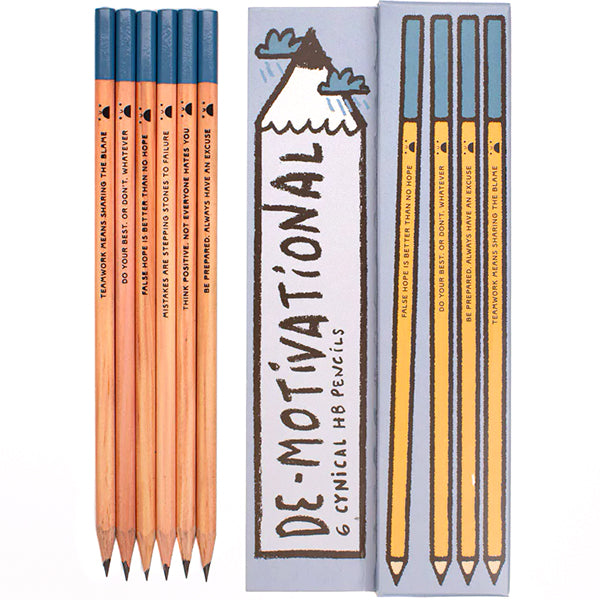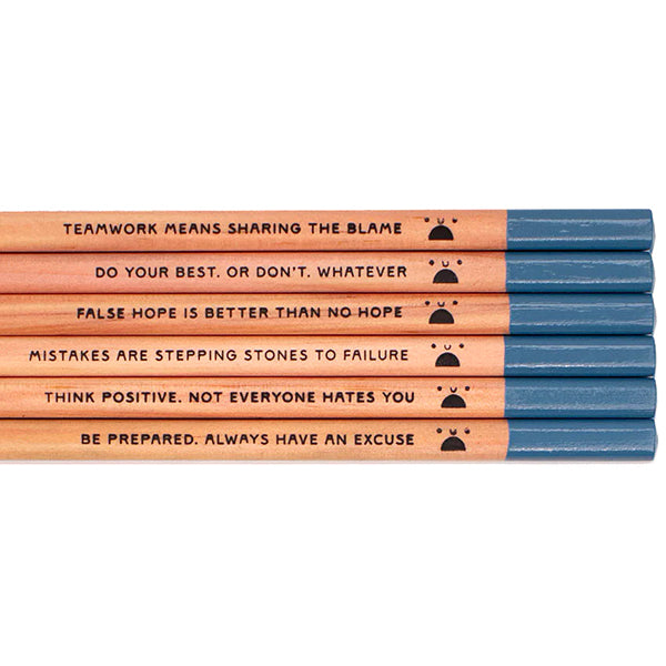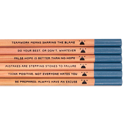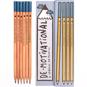 The six pencils in this set all feature really un-motivational messages such as 'False hope is better than no hope'. All rather entertaining if not not very productive...