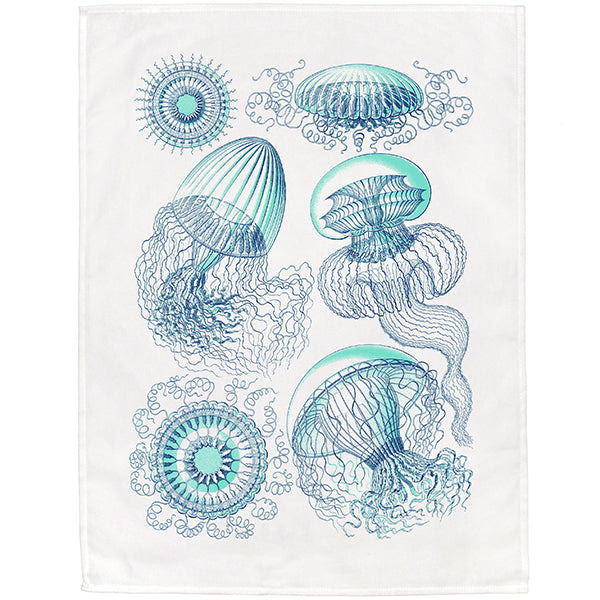 This tea towel features vintage 19th century illustrations of gelatinous zooplankton, by biologist and naturalist Ernst Haeckel.