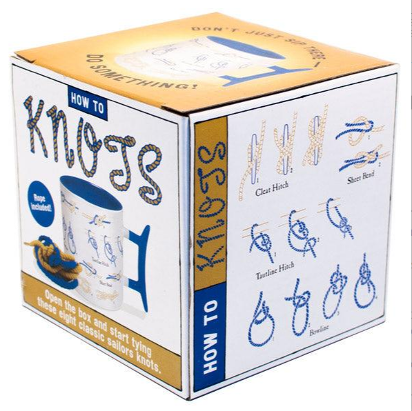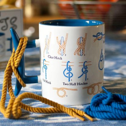 Sip your morning coffee and learn to tie eight different nautical knots. With a cleat for a handle, this mug comes with a length of rope to get you started on the various hitches, loops and bends. Would make a useful gift for sailors and scouts.