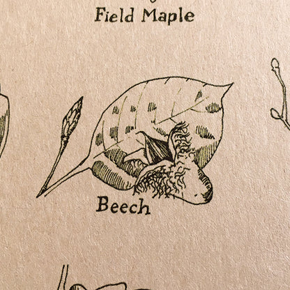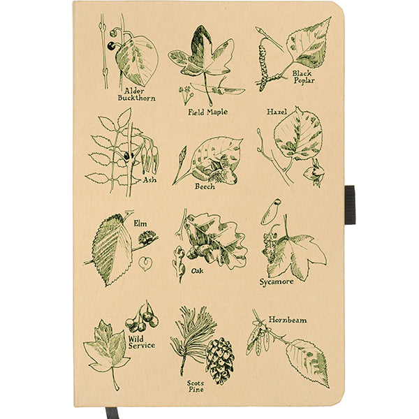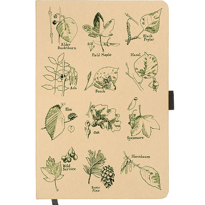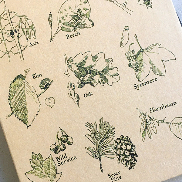 Twelve beautiful illustrations of the leaves, twigs, fruits and other identifying features of some common European trees. Printed in dark green on a natural buff notebook.