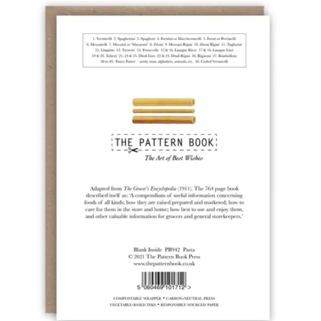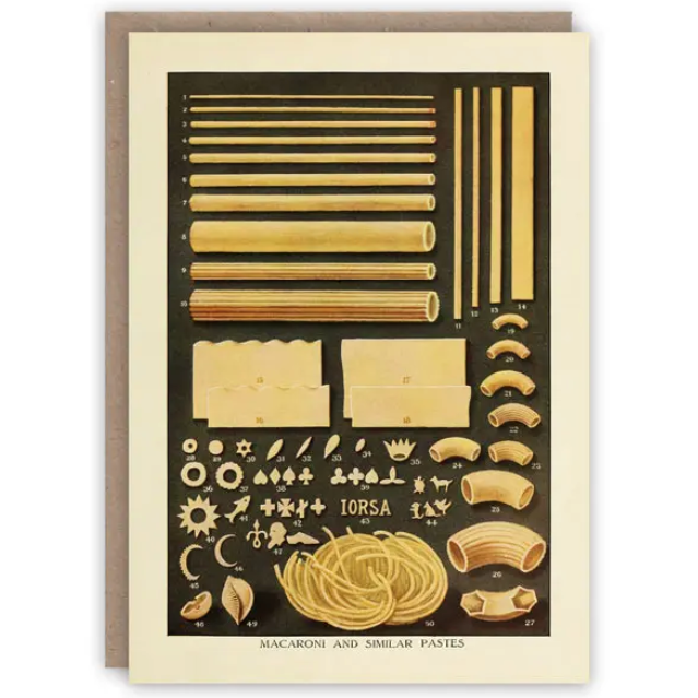 Adapted from The Grocer’s Encyclopedia (1911) and still perfect for those who need to know their Spaghetti from their Spaghettini. There is a key to all the pasta varieties on the reverse of the card.