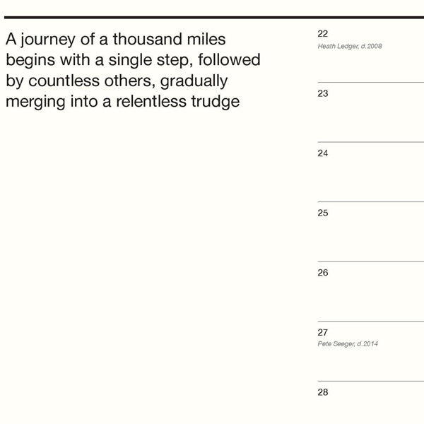 This may not be your year. But this is definitely your diary. This Edition includes: Realistic Mindfulness Prompts, Demotivational Proverbs, Unhelpful Folk Rhymes, Bleak Strategies, Even Worse Case Scenarios, Boring Crosswords, Notable Deaths, Bank Insecurity Questions, People Who Never Call, Notes Towards A Dull Novel, Pointless Doodles.