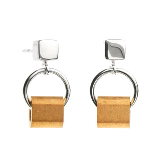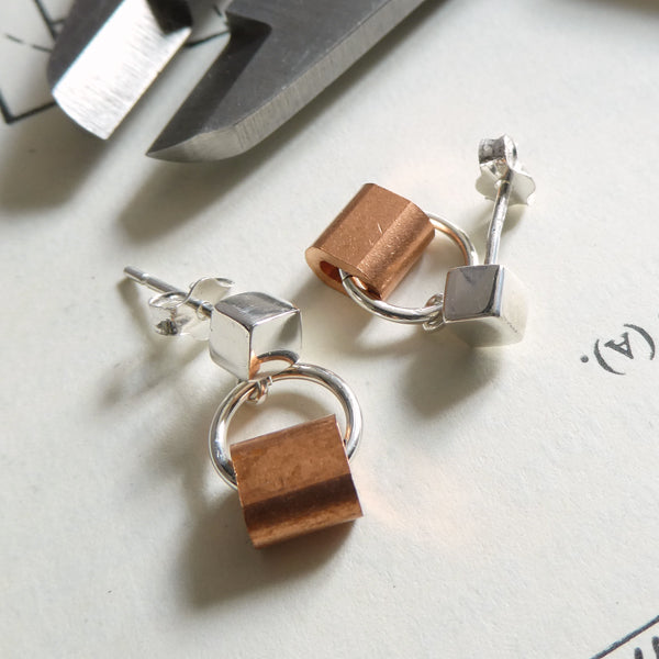 These delicate earrings mix two beautiful metals to create a kinetic sculpture for you to wear. The sterling silver 4mm cube-shaped studs are connected to the copper tube by a sterling silver hoop. The copper tubes are ferrules, used in sailing to secure wire ropes.