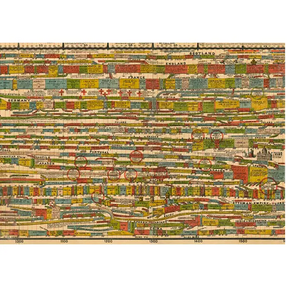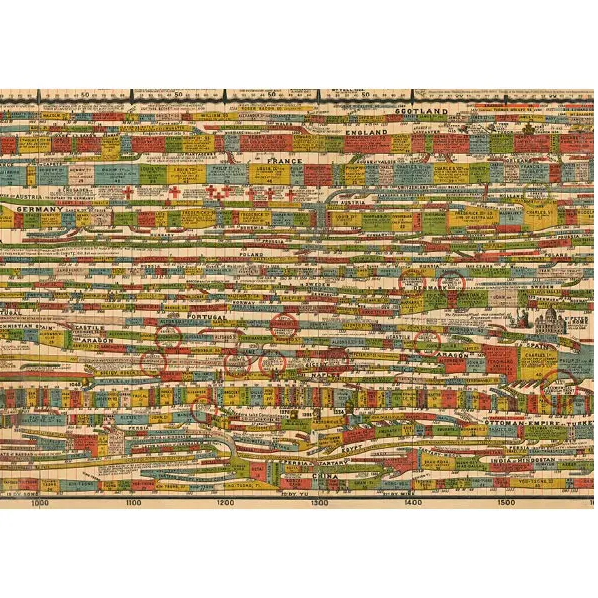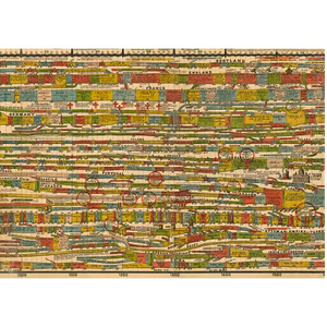 Section from Adam’s Illustrated Panorama of History (1878, third edition), charting world history from 1000 to 1600AD, including dynasties, rulers and significant events. At 68cm high, the original panorama starts with the creation of Adam in 4004 BC and is 660cm long. Printed with vegetable-based inks on a carbon neutral press using responsibly sourced, acid free paper. Shipped plastic free.