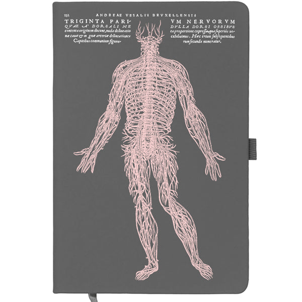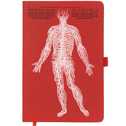 "A drawing of the Thirty Pairs of Nerves dissected out, which arise from the back of the medulla contained in the vertebrae." from Andreas Vesalius' Ars Anatomica, 1555 edition. This notebook is printed with a rich, raised and textured image of the original woodcut.